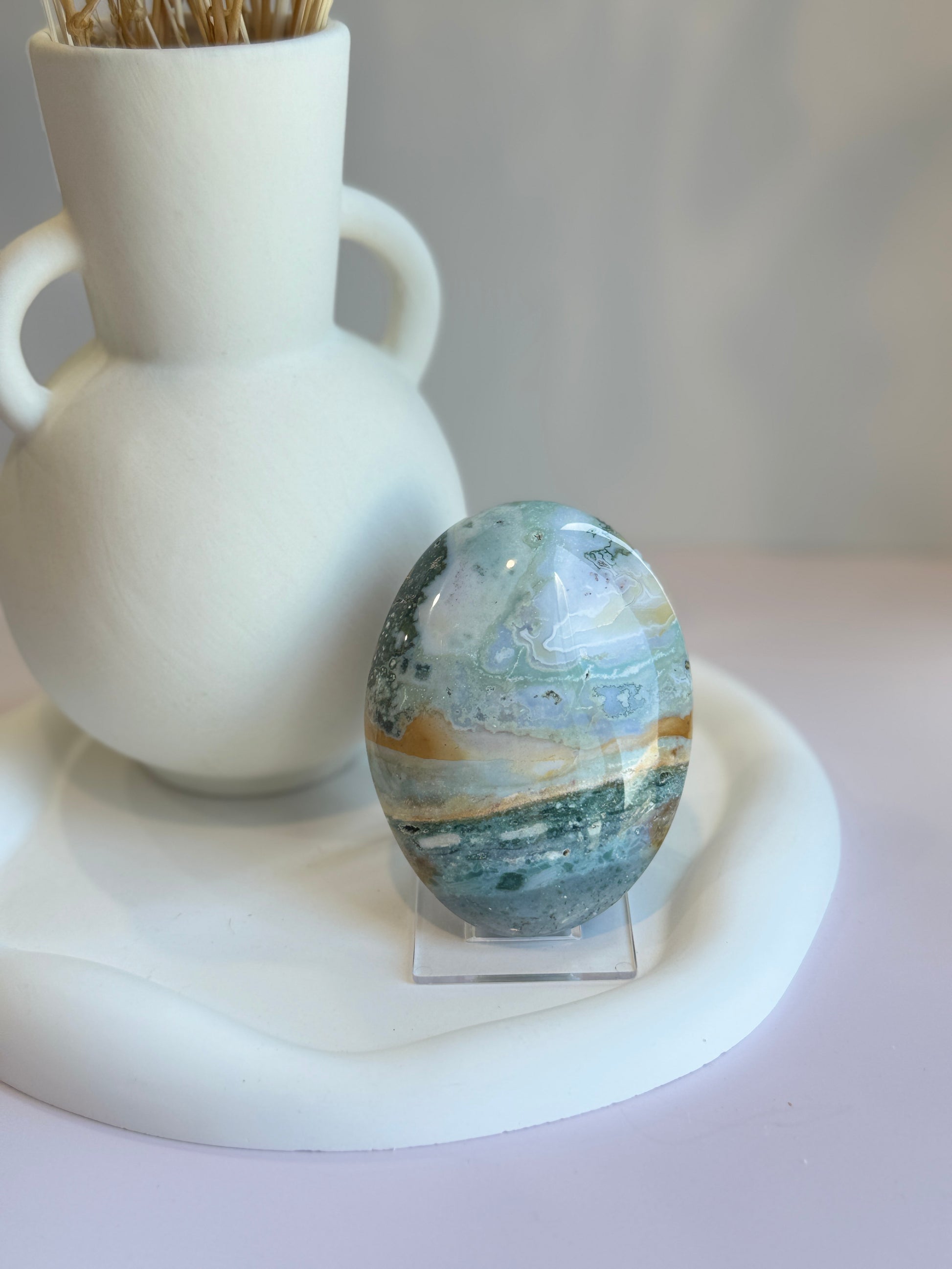 Ocean Jasper is a deeply nurturing and uplifting stone, carrying the rhythmic energy of the tides and the gentle cleansing strength of the sea. Formed along the ancient coastline of Madagascar, each piece holds swirling patterns, soothing colours, and orbs that resemble waves, bubbles, and coastal tides โ making it a truly one-of-a-kind treasure.