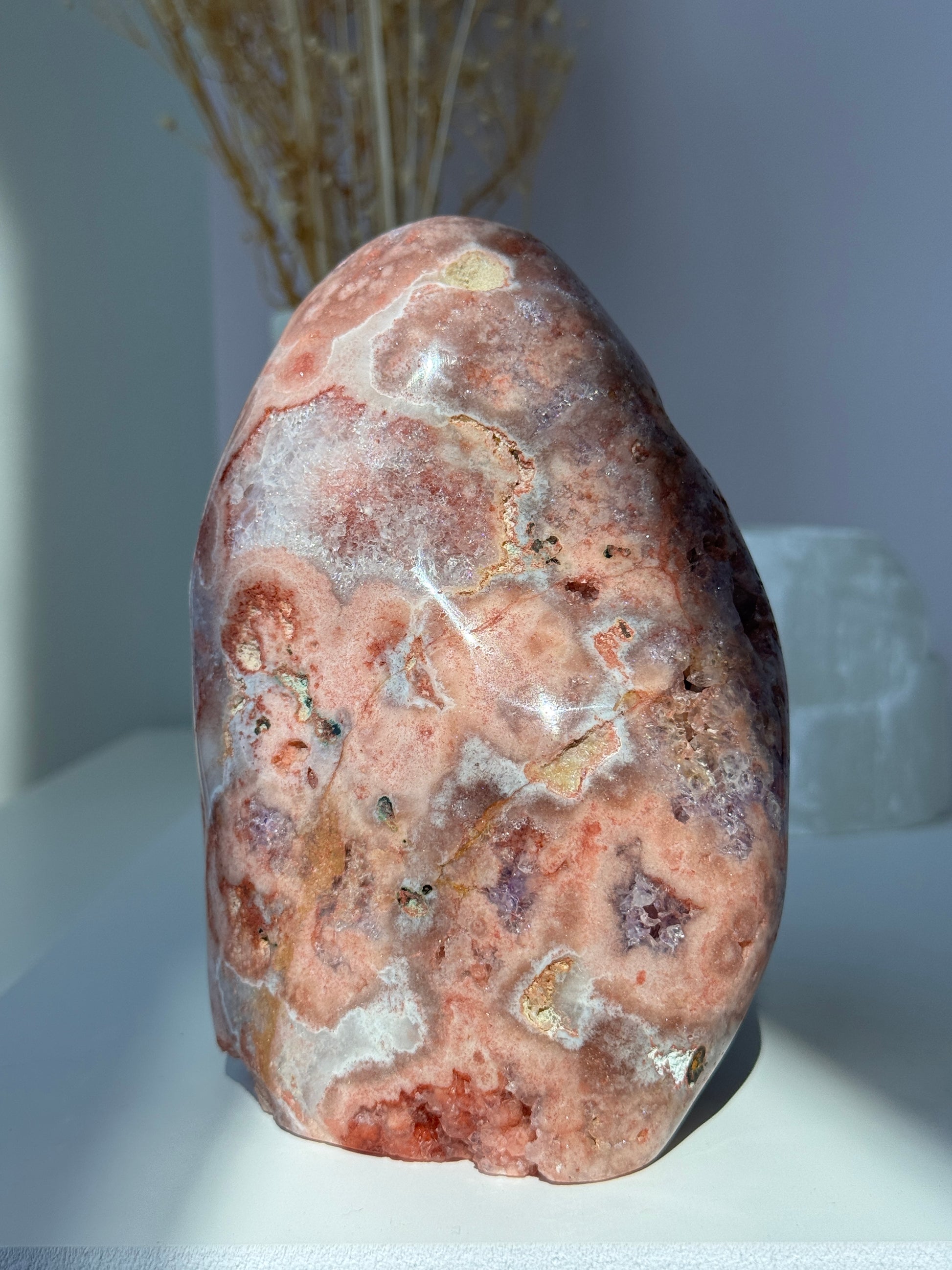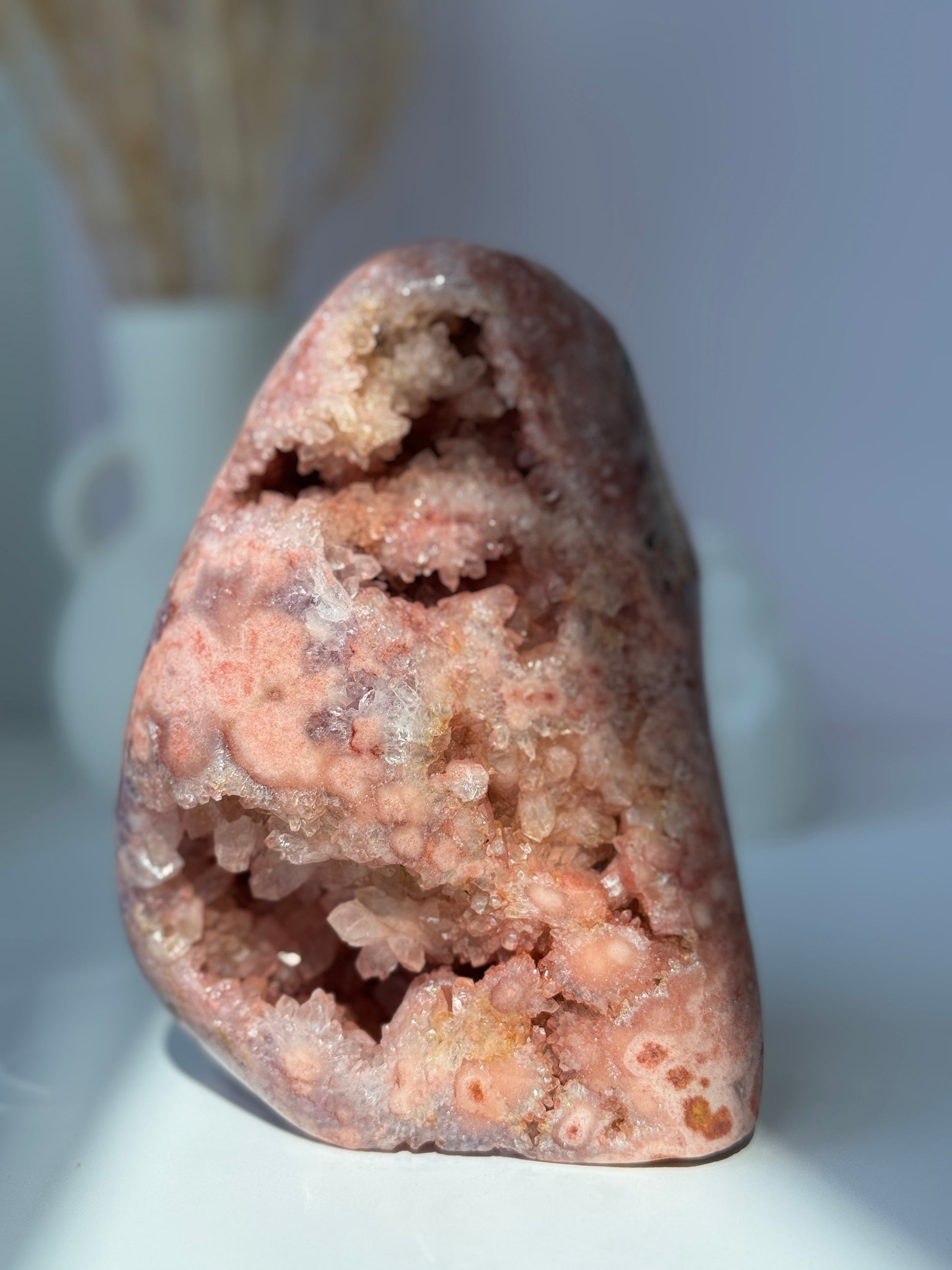 Pink Amethyst works like a soft veil of light around your aura. Spiritually, she: